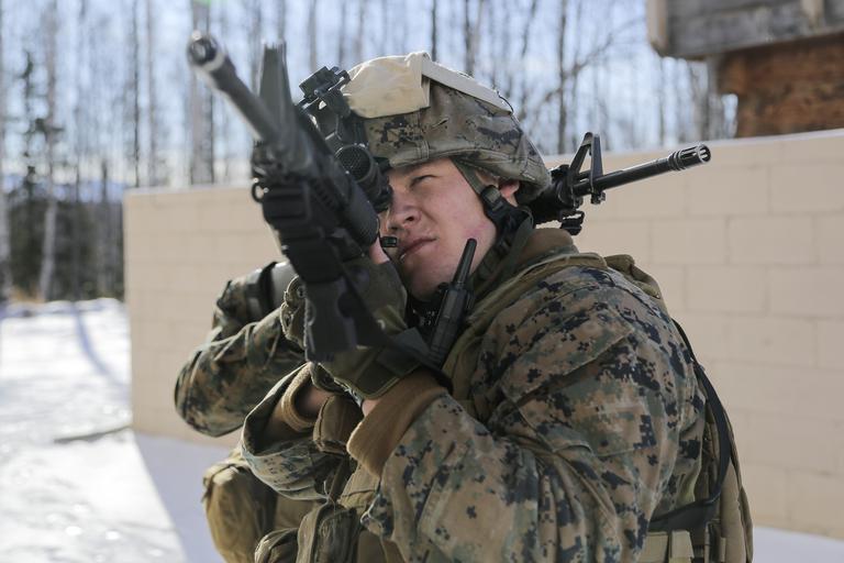 | Keywords: 4th law enforcement battalion 4thlawenforcementbattalion mout military operation on urban terrain militaryoperationonurbanterrain military police militarypolice joint base elmendorf-richardson jointbaseelmendorfrichardson alaska usa us people U.S. Marine Corps Cpl. Joseph Myers, assigned to Detachment Military Police Company D, 4th Law Enforcement Battalion, holds a security position while assaulting Baumeister City military operations on urban terrain (MOUT) complex at Joint Base Elmendorf-Richardson, Alaska, March 6, 2016. The MOUT training prepared the Marines for their upcoming deployment to Serbia where they will serve as military police advisors. (U.S. Air Force photo/Alejandro Peña) U.S. Marine Corps Cpl. Joseph Myers, assigned to Detachment Military Police Company D, 4th Law Enforcement Battalion, holds a security position while assaulting Baumeister City military operations on urban terrain (MOUT) complex at Joint Base Elmendorf-Richardson, Alaska, March 6, 2016. The MOUT training prepared the Marines for their upcoming deployment to Serbia where they will serve as military police advisors. (U.S. Air Force photo/Alejandro Peña) |