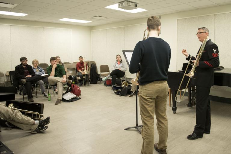 Keywords: indoor AMHERST, MASS (Mar. 7, 2016) Musician First Class Andrew Skaggs coaches a student during a masterclass held at UMass, Amherst; part of the band's mission to provide outreach and education. The U.S. Navy Band is on a 25-day tour of the northeastern United States. (U.S. Navy photo by Chief Musician Melissa Bishop/Released) AMHERST, MASS (Mar. 7, 2016) Musician First Class Andrew Skaggs coaches a student during a masterclass held at UMass, Amherst; part of the band's mission to provide outreach and education. The U.S. Navy Band is on a 25-day tour of the northeastern United States. (U.S. Navy photo by Chief Musician Melissa Bishop/Released)