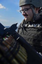 Keywords: navy mediterranean ddg 64 ddg64 cne-c6f cnec6f sixth fleet sixthfleet palma de mallorca palmademallorca people outdoor 160311-N-FP878-146 MEDITERRANEAN SEA, Spain (March 11, 2016) Yeoman 3rd Class Alex Minichello, from Eden, North Carolina, stands security watch as USS Carney (DDG 64) departs from Palma De Mallorca, Spain, March 11, 2016. Carney, an Arleigh Burke-class guided-missile destroyer, forward deployed to Rota, Spain, is conducting a routine patrol in the U. S. 6th Fleet area of operations in support of U.S. national security interests in Europe. (U.S. Navy photo by Mass Communication Specialist 1st Class Theron J. Godbold/Released) 160311-N-FP878-146 MEDITERRANEAN SEA, Spain (March 11, 2016) Yeoman 3rd Class Alex Minichello, from Eden, North Carolina, stands security watch as USS Carney (DDG 64) departs from Palma De Mallorca, Spain, March 11, 2016. Carney, an Arleigh Burke-class guided-missile destroyer, forward deployed to Rota, Spain, is conducting a routine patrol in the U. S. 6th Fleet area of operations in support of U.S. national security interests in Europe. (U.S. Navy photo by Mass Communication Specialist 1st Class Theron J. Godbold/Released) |