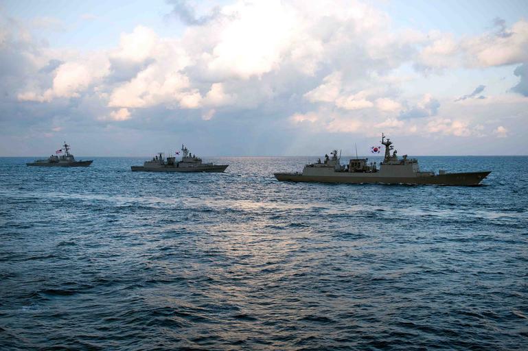 Keywords: uss mobile bay ussmobilebay cg53 cruiser underway deployment pacific ocean mob foal eagle foaleagle 2016 pacific ocean pacificocean usa outdoor boat vehicle water landscape seaside shore sea 160324-N-EH218-097 WATERS SURROUNDING THE KOREAN PENINSULA (March 24, 2016) – The Chungmugong Yi Sun-shin class destroyer ROKS Gang Gam-chan (DDH 979), the Gwanggaeto the Great class destroyer ROKS Gwangaetto the Great (DDH 971), and the guided-missile destroyer USS Chung-Hoon (DDG 93) steam together during Maritime Counter Special Operations Forces (MCSOF) exercise, which is part of Foal Eagle 2016. Foal Eagle is an annual, bilateral training exercise designed to enhance the readiness of U.S. and Republic of Korea forces and their ability to work together during a crisis. Providing a ready force supporting security and stability in the Indo-Asia-Pacific, Chung-Hoon is operating as part of the John C. Stennis Strike Group and Great Green Fleet on a regularly scheduled 7th Fleet deployment. (U.S. Navy photo by Mass Communication Specialist 2nd Class Ryan J. Batchelder/Released) 160324-N-EH218-097 WATERS SURROUNDING THE KOREAN PENINSULA (March 24, 2016) – The Chungmugong Yi Sun-shin class destroyer ROKS Gang Gam-chan (DDH 979), the Gwanggaeto the Great class destroyer ROKS Gwangaetto the Great (DDH 971), and the guided-missile destroyer USS Chung-Hoon (DDG 93) steam together during Maritime Counter Special Operations Forces (MCSOF) exercise, which is part of Foal Eagle 2016. Foal Eagle is an annual, bilateral training exercise designed to enhance the readiness of U.S. and Republic of Korea forces and their ability to work together during a crisis. Providing a ready force supporting security and stability in the Indo-Asia-Pacific, Chung-Hoon is operating as part of the John C. Stennis Strike Group and Great Green Fleet on a regularly scheduled 7th Fleet deployment. (U.S. Navy photo by Mass Communication Specialist 2nd Class Ryan J. Batchelder/Released) |