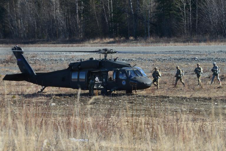 MAKE A MEME View Large Image Airmen and Soldiers perform static and free-fall parachute jumps out of UH-60 Black Hawk helicopters as part of Grizzly Breakup, a training exercise, at Malemute drop zone, Joint Base Elmendorf-Richardson, Alaska, April 18, 2016. Grizzly ...