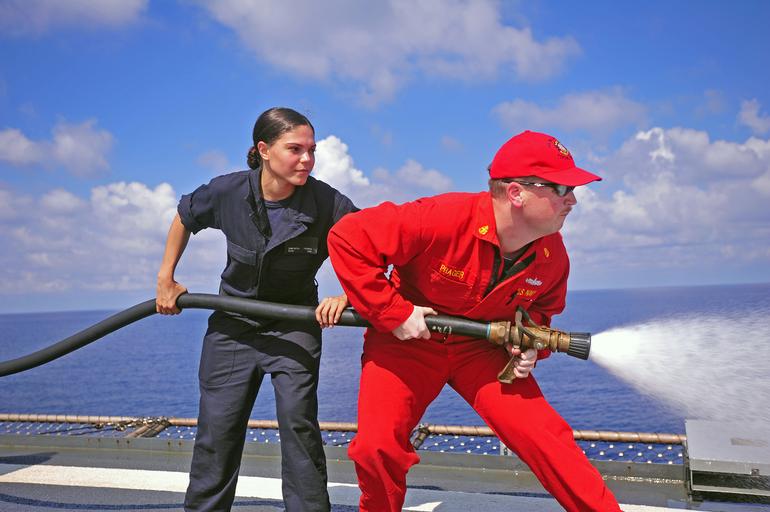 Keywords: flag ship flagship lcc-19 lcc19 u.s. navy usnavy uss blue ridge ussblueridge underway afff flying squad flyingsquad japan outdoor 160425-N-TV402-086 SOUTH CHINA SEA (April 25, 2016) - Damage Controlman Fireman Samantha Thomas, left, attached to the U.S. 7th Fleet flagship USS Blue Ridge (LCC 19) and Chief Damage Controlman Erik Prager, right, attached to Commander, Task Force 76 Detachment Sasebo, conduct training with an aqueous film forming foam hose. Blue Ridge is currently on patrol in the 7th Fleet area of operations strengthening and fostering relationships within the Indo-Asia-Pacific. (U.S. Navy photo by Mass Communication Specialist Seaman Timothy Hale/RELEASED) 160425-N-TV402-086 SOUTH CHINA SEA (April 25, 2016) - Damage Controlman Fireman Samantha Thomas, left, attached to the U.S. 7th Fleet flagship USS Blue Ridge (LCC 19) and Chief Damage Controlman Erik Prager, right, attached to Commander, Task Force 76 Detachment Sasebo, conduct training with an aqueous film forming foam hose. Blue Ridge is currently on patrol in the 7th Fleet area of operations strengthening and fostering relationships within the Indo-Asia-Pacific. (U.S. Navy photo by Mass Communication Specialist Seaman Timothy Hale/RELEASED) |