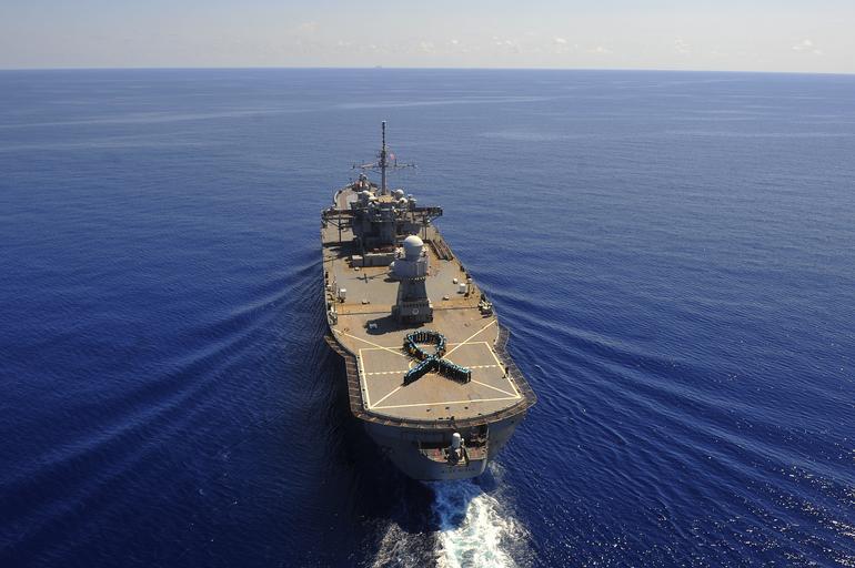 Keywords: 160425-N-YL053-088 160425-N-YL053-088.jpg en 160425-N-YL053-088 SOUTH CHINA SEA April 25 2016 - Blue Ridge and 7th Fleet staff Sailors form themselves into a teal ribbon in support of Sexual Assault Prevention and Response SAPR Awareness Month USS Blue Ridge sailors and embarked 7th Fleet staff hosted multiple events highlighting the importance of sexual assault prevention Blue Ridge is currently on patrol in the 7th Fleet area of operations strengthening and fostering relationships within the Indo-Asia-Pacific U S Navy photo by Mass Communication Specialist 3rd Class Don Patton/ RELEASED <br>Unit Navy Media Content Services 2016-04-25 Petty Officer 3rd Class Don Patton https //www dvidshub net/image/2553402/160425-n-yl053-088 160425-N-YL053-088 2016-04-27 00 05 USS BLUE RIDGE PD-USGov-Military-Navy USS Blue Ridge LCC-19 Images from DoD uploaded by Fæ |
