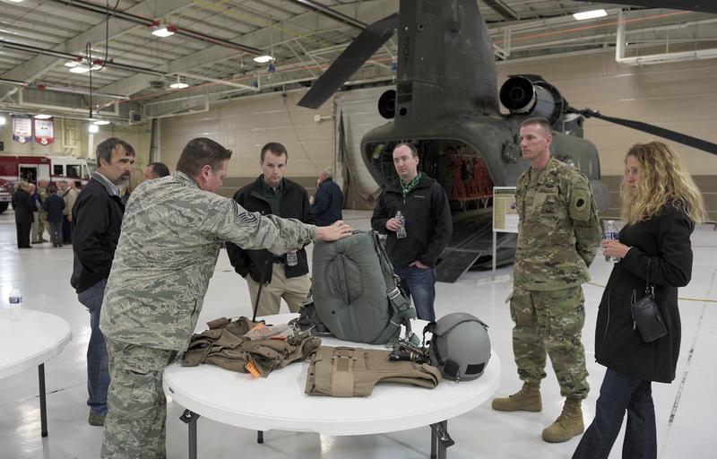 | Keywords: air force usaf 182 aw airlift wing peoria illinois ill il ang national guard ngb mobility command amc z northcom esgr civilian employer support reserve breakfast boss comrel community relations afe parachute usa us U.S. Air Force Senior Master Sgt. Daniel P. Svymbersky, the aircrew flight equipment superintendent at the 182nd Operations Support Squadron, Illinois Air National Guard, explains the functions of an aircrew parachute to civilian employers during an Employer Support of the Guard and Reserve “Breakfast with the Boss” event at the 182nd Airlift Wing, Peoria, Ill., April 27, 2016. The attendees toured the base to see firsthand how their employees serve the Illinois National Guard. (U.S. Air National Guard photo by Staff Sgt. Lealan Buehrer) U.S. Air Force Senior Master Sgt. Daniel P. Svymbersky, the aircrew flight equipment superintendent at the 182nd Operations Support Squadron, Illinois Air National Guard, explains the functions of an aircrew parachute to civilian employers during an Employer Support of the Guard and Reserve “Breakfast with the Boss” event at the 182nd Airlift Wing, Peoria, Ill., April 27, 2016. The attendees toured the base to see firsthand how their employees serve the Illinois National Guard. (U.S. Air National Guard photo by Staff Sgt. Lealan Buehrer) |