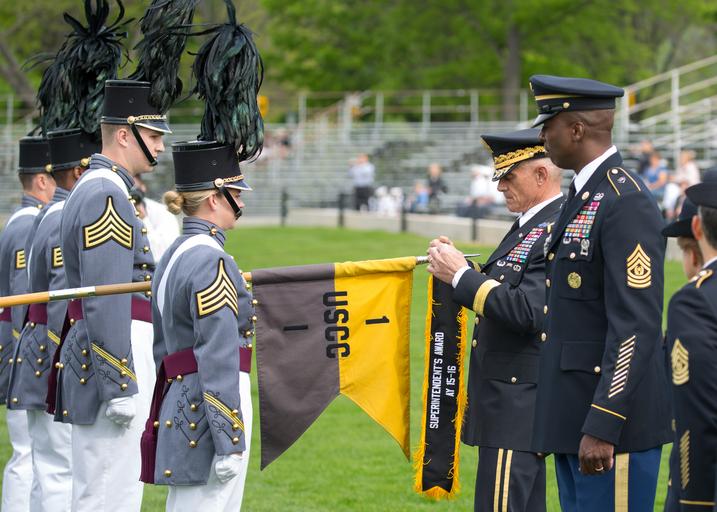 | Keywords: cadets awards review awardsreview class of 2016 classof2016 academics athletics superintendent caslen holland commandant outdoor Superintendent of the U.S. Military Academy, Lt. Gen. Robert L. Caslen, Jr., and Commandant of the U.S. Corps of Cadets, Brig. Gen. Diana Holland, present award streamers for excellence during the 2015-2016 academic year, May 18 at West Point. (U.S. Army photo by: Staff Sgt. Vito T. Bryant) Superintendent of the U.S. Military Academy, Lt. Gen. Robert L. Caslen, Jr., and Commandant of the U.S. Corps of Cadets, Brig. Gen. Diana Holland, present award streamers for excellence during the 2015-2016 academic year, May 18 at West Point. (U.S. Army photo by: Staff Sgt. Vito T. Bryant) |
