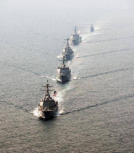 Keywords: pac sag pacsag surface action group surfaceactiongroup momsen waters surrounding the korean peninsula waterssurroundingthekoreanpeninsula usa outdoor 160522-N-YU572-395 WATERS SURROUNDING THE KOREAN PENINSULA (May 21, 2016) The guided-missile destroyer USS Momsen (DDG 92), bottom, Republic of Korea destroyer ROKS Seoae Ryu Seong-ryong (DDG-993), guided-missile destroyer USS Decatur (DDG 73), Republic of Korea destroyer ROKS Yulgok Yi (DDG-992) and Republic of Korea patrol craft ROKS Kwang Myung (PCC-782) steam in formation during a bilateral maneuvering exercise. The destroyers USS Spruance (DDG 111), Momsen and Decatur, with embarked “Devil Fish” and “Warbirds” detachments of Helicopter Maritime Strike Squadron (HSM) 49, are deployed as part of a U.S. 3rd Fleet Pacific Surface Action Group (PAC SAG) under Destroyer Squadron (CDS) 31. (U.S. Navy photo by Mass Communication Specialist 1st Class Jay C. Pugh/Released) 160522-N-YU572-395 WATERS SURROUNDING THE KOREAN PENINSULA (May 21, 2016) The guided-missile destroyer USS Momsen (DDG 92), bottom, Republic of Korea destroyer ROKS Seoae Ryu Seong-ryong (DDG-993), guided-missile destroyer USS Decatur (DDG 73), Republic of Korea destroyer ROKS Yulgok Yi (DDG-992) and Republic of Korea patrol craft ROKS Kwang Myung (PCC-782) steam in formation during a bilateral maneuvering exercise. The destroyers USS Spruance (DDG 111), Momsen and Decatur, with embarked “Devil Fish” and “Warbirds” detachments of Helicopter Maritime Strike Squadron (HSM) 49, are deployed as part of a U.S. 3rd Fleet Pacific Surface Action Group (PAC SAG) under Destroyer Squadron (CDS) 31. (U.S. Navy photo by Mass Communication Specialist 1st Class Jay C. Pugh/Released) |