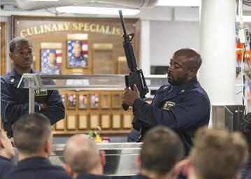 | Keywords: mediterranean sea mediterraneansea indoor 160607-N-GP524-569 MEDITERRANEAN SEA (June 7, 2016) – Chief Gunner’s Mate Todrick Christful conducts a weapons familiarization training course on the mess deck aboard USS Stout (DDG 55) June 7, 2016. Stout, an Arleigh Burke-class guided-missile destroyer, deployed as part of the Eisenhower Carrier Strike Group, is conducting naval operations in the U.S. 6th Fleet area of operations in support of U.S. national security interests in Europe. (U.S. Navy photo by Mass Communication Specialist 3rd Class Bill Dodge/Released) 160607-N-GP524-569 MEDITERRANEAN SEA (June 7, 2016) – Chief Gunner’s Mate Todrick Christful conducts a weapons familiarization training course on the mess deck aboard USS Stout (DDG 55) June 7, 2016. Stout, an Arleigh Burke-class guided-missile destroyer, deployed as part of the Eisenhower Carrier Strike Group, is conducting naval operations in the U.S. 6th Fleet area of operations in support of U.S. national security interests in Europe. (U.S. Navy photo by Mass Communication Specialist 3rd Class Bill Dodge/Released) |