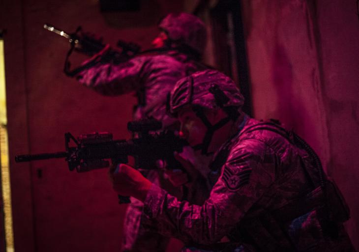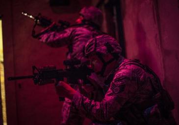 | Keywords: usaf u.s. air force usairforce air national guard airnationalguard new jersey newjersey 177th security forces squadron 177thsecurityforcessquadron m4 training joint base mcguire-dix-lakehurst jointbasemcguiredixlakehurst jt2dc n.j. nj usa public domain publicdomain free indoor U.S. Air Force Staff Sgt. Christopher Raine, front, and Tech. Sgt. Anthony Lemons provide cover for teammates during training at an indoor Military Operations in Urban Terrain (MOUT) site at the New Jersey National Guard's Joint Training & Training Development Center (JT2DC), Joint Base McGuire-Dix-Lakehurst, N.J., June 16, 2016. Raine and Lemons are Security Forces specialists assigned to the New Jersey Air National Guard's 177th Security Forces Squadron. The 177th Security Forces Squadron was utilizing the ability for the JT2DC's training areas to simulate low-light conditions in an urban environment. The red and blue lighting simulates a moonlit night as seen through night vision devices. (U.S. Air National Guard photo by Tech. Sgt. Matt Hecht/Released) U.S. Air Force Staff Sgt. Christopher Raine, front, and Tech. Sgt. Anthony Lemons provide cover for teammates during training at an indoor Military Operations in Urban Terrain (MOUT) site at the New Jersey National Guard's Joint Training & Training Development Center (JT2DC), Joint Base McGuire-Dix-Lakehurst, N.J., June 16, 2016. Raine and Lemons are Security Forces specialists assigned to the New Jersey Air National Guard's 177th Security Forces Squadron. The 177th Security Forces Squadron was utilizing the ability for the JT2DC's training areas to simulate low-light conditions in an urban environment. The red and blue lighting simulates a moonlit night as seen through night vision devices. (U.S. Air National Guard photo by Tech. Sgt. Matt Hecht/Released) |