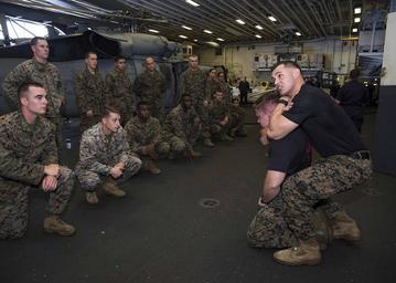 Keywords: 22 meu 22meu amphibious ready group amphibiousreadygroup amphibious ready group/marine expeditionary unit amphibiousreadygroupmarineexpeditionaryunit lhd 1 lhd1 marines training u.s. marine corps usmarinecorps uss wasp usswasp chokehold combat skills combatskills hand-to-hand handtohand mediterranean sea mediterraneansea 160718-N-TO519-143 MEDITERRANEAN SEA (July 18, 2016) Staff Sgt. William Kelley, right, and Staff Sgt. Zebulon Enright teach Marines a choke hold aboard the amphibious assault ship USS Wasp (LHD 1) July 18, 2016. Wasp is deployed with the Wasp Amphibious Ready Group to support maritime security operations and theater security cooperation efforts in the U.S. 6th Fleet area of operations. (U.S. Navy photo by Mass Communication Specialist 2nd Class Nathan Wilkes/Released) 160718-N-TO519-143 MEDITERRANEAN SEA (July 18, 2016) Staff Sgt. William Kelley, right, and Staff Sgt. Zebulon Enright teach Marines a choke hold aboard the amphibious assault ship USS Wasp (LHD 1) July 18, 2016. Wasp is deployed with the Wasp Amphibious Ready Group to support maritime security operations and theater security cooperation efforts in the U.S. 6th Fleet area of operations. (U.S. Navy photo by Mass Communication Specialist 2nd Class Nathan Wilkes/Released)