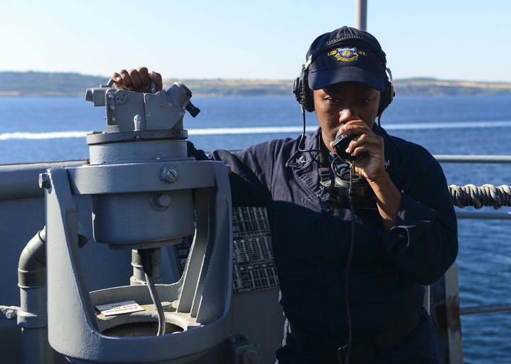 Keywords: strait transit straittransit quartermaster's mate quartermastersmate turkish straits turkishstraits outdoor 160721-N-TI017-036 BOSPHORUS STRAIT (July 21, 2016) Quartermaster 3rd Class Marquita Murphy speaks into a sound-powered telephone on the bridge wing of the amphibious dock landing ship USS Whidbey Island (LSD 41) July 21, 2016. Whidbey Island is deployed with the Wasp Amphibious Ready Group to support maritime security operations and theater security cooperation efforts in the U.S. 6th Fleet area of operations. (U.S. Navy photo by Mass Communication Specialist 2nd Class Nathan R. McDonald/Released) 160721-N-TI017-036 BOSPHORUS STRAIT (July 21, 2016) Quartermaster 3rd Class Marquita Murphy speaks into a sound-powered telephone on the bridge wing of the amphibious dock landing ship USS Whidbey Island (LSD 41) July 21, 2016. Whidbey Island is deployed with the Wasp Amphibious Ready Group to support maritime security operations and theater security cooperation efforts in the U.S. 6th Fleet area of operations. (U.S. Navy photo by Mass Communication Specialist 2nd Class Nathan R. McDonald/Released) |