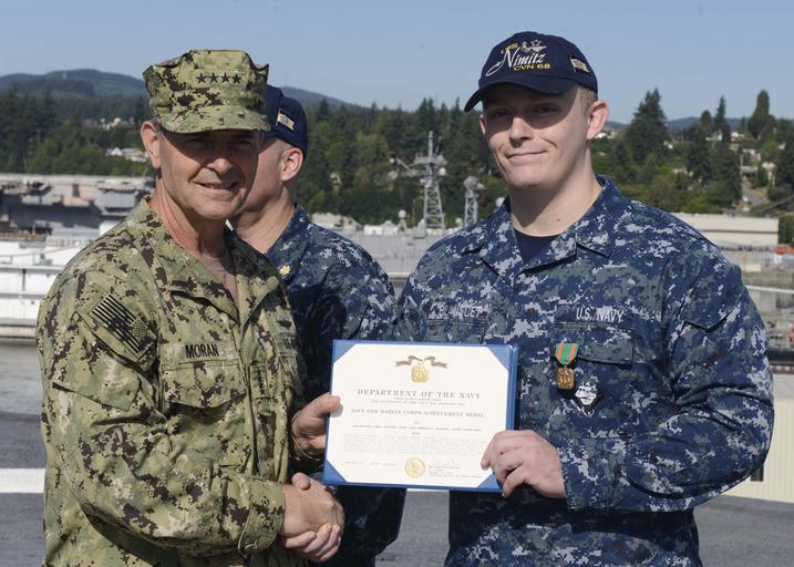 Keywords: 160725-N-DA275-089 160725-N-DA275-089.jpg en NAVAL BASE KITSAP-BREMERTON Wash July 25 2016 Electrician's Mate Nuclear 3rd Class Brenden M Blanscet receives a Navy/Marine Corps Achievement Medal from Adm Bill Moran Vice Chief of Naval Operations on the flight deck of USS Nimitz CVN 68 for responding to an electrical shock victim on the pier Blanscet assisted in moving the victim clear of a hazardous area as well as assisting emergency medical responders to the scene while administering first aid Nimitz is currently undergoing an extended planned incremental maintenance availability at Puget Sound Naval Shipyard and Intermediate Maintenance Facility where the ship is receiving scheduled maintenance and upgrades U S Navy photo by Mass Communication Specialist 3rd Class Samuel H Bacon/Released <br>Unit Navy Media Content Services 2016-07-25 Samuel H Bacon https //www dvidshub net/image/2765826/160725-n-da275-089 160725-N-DA275-089 2016-08-04 00 02 NAVAL BASE KITSAP - BREMERTON WASHINGTON US PD-USGov-Military-Navy Naval Base Kitsap USS Nimitz CVN-68 Images from DoD uploaded by FĂŚ |