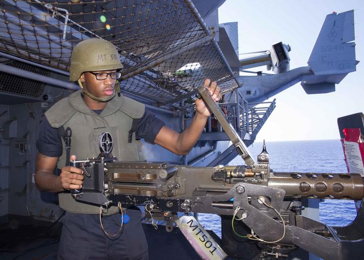 Keywords: .50 caliber machine gun 50calibermachinegun amphibious ready group amphibiousreadygroup lhd 1 lhd1 scat sailors u.s. navy usnavy uss wasp usswasp wasp arg wasparg small caliber action team smallcaliberactionteam watch mediterranean sea mediterraneansea 160730-N-TO519-047 MEDITERRANEAN SEA (July 30, 2016) Information Systems Technician 3rd Class Kiyan Stamper inspects a .50 caliber machine gun aboard the amphibious assault ship USS Wasp (LHD 1) July 30, 2016. Wasp is deployed with the Wasp Amphibious Ready Group to support maritime security operations and theater security cooperation efforts in the U.S. 6th Fleet area of operations. (U.S. Navy photo by Mass Communication Specialist 2nd Class Nathan Wilkes/Released) 160730-N-TO519-047 MEDITERRANEAN SEA (July 30, 2016) Information Systems Technician 3rd Class Kiyan Stamper inspects a .50 caliber machine gun aboard the amphibious assault ship USS Wasp (LHD 1) July 30, 2016. Wasp is deployed with the Wasp Amphibious Ready Group to support maritime security operations and theater security cooperation efforts in the U.S. 6th Fleet area of operations. (U.S. Navy photo by Mass Communication Specialist 2nd Class Nathan Wilkes/Released) |