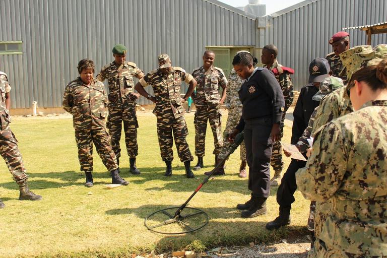 | Keywords: otavia namibia eodmu 8 eodmu8 u.s. 6th fleet us6thfleet people outdoor 160801-N-XX888-003 OTAVI, Namibia (Aug. 1, 2016) Explosive Ordnance Disposal Mobile Unit 8 conducts metal detector training with members of the Namibian Defense and Police Forces in Otavi, Namibia, Aug. 1, 2016. U.S. 6th Fleet, headquartered in Naples, Italy, conducts the full spectrum of joint and naval operations, often in concert with allied, joint, and interagency partners, in order to advance U.S. national interests and security and stability in Europe and Africa. (US Navy photo by Hospital Corpsman 3rd Class Daniel Jarosz/Released) 160801-N-XX888-003 OTAVI, Namibia (Aug. 1, 2016) Explosive Ordnance Disposal Mobile Unit 8 conducts metal detector training with members of the Namibian Defense and Police Forces in Otavi, Namibia, Aug. 1, 2016. U.S. 6th Fleet, headquartered in Naples, Italy, conducts the full spectrum of joint and naval operations, often in concert with allied, joint, and interagency partners, in order to advance U.S. national interests and security and stability in Europe and Africa. (US Navy photo by Hospital Corpsman 3rd Class Daniel Jarosz/Released) |