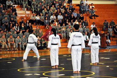 | Keywords: taekwondo u.s. army usarmy u.s. marine corps usmarinecorps u.s. navy usnavy u.s. air force usairforce presidio of monterey presidioofmonterey korea sport team sport The Kukkiwon Taekwondo Demonstration Team from Korea performed a traditional martial arts demonstration at the Presidio of Monterey, California, Price Fitness Center Aug. 3. The Defense Language Institute Foreign Language Center Korean School hosted the event. Following the demonstration, the team answered questions in Korean for the benefit of the students. Kukkiwon, known as the World Taekwondo Headquarters, is the center of taekwondo culture in Korea with teams touring about 120 countries as ambassadors of the traditional martial art for the past 40 years. (U.S. Army photo by Patrick Bray/Released) The Kukkiwon Taekwondo Demonstration Team from Korea performed a traditional martial arts demonstration at the Presidio of Monterey, California, Price Fitness Center Aug. 3. The Defense Language Institute Foreign Language Center Korean School hosted the event. Following the demonstration, the team answered questions in Korean for the benefit of the students. Kukkiwon, known as the World Taekwondo Headquarters, is the center of taekwondo culture in Korea with teams touring about 120 countries as ambassadors of the traditional martial art for the past 40 years. (U.S. Army photo by Patrick Bray/Released) |