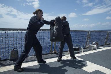 Keywords: uss carney (ddg 64); 6th fleet; usscarneyddg646thfleet mediterranean sea mediterraneansea outdoor 160824-N-ZE250-050 MEDITERRANEAN SEA (Aug. 24, 2016) - Operations Specialist Seaman Kristy Shearer, left, and Operations Specialist Seaman Mary Brown practice basic hand-to-hand combat during the Security Reaction Force Bravo course aboard USS Carney (DDG 64) while on patrol in the Mediterranean Sea Aug. 24, 2016. Carney, an Arleigh Burke-class guided-missile destroyer, forward-deployed to Rota, Spain, is conducting a routine patrol in the U.S. 6th fleet area of operations in support of U.S. national security interests in Europe. (U.S. Navy photo by Mass Communication Specialist 3rd Class Weston Jones/Released) 160824-N-ZE250-050 MEDITERRANEAN SEA (Aug. 24, 2016) - Operations Specialist Seaman Kristy Shearer, left, and Operations Specialist Seaman Mary Brown practice basic hand-to-hand combat during the Security Reaction Force Bravo course aboard USS Carney (DDG 64) while on patrol in the Mediterranean Sea Aug. 24, 2016. Carney, an Arleigh Burke-class guided-missile destroyer, forward-deployed to Rota, Spain, is conducting a routine patrol in the U.S. 6th fleet area of operations in support of U.S. national security interests in Europe. (U.S. Navy photo by Mass Communication Specialist 3rd Class Weston Jones/Released) |