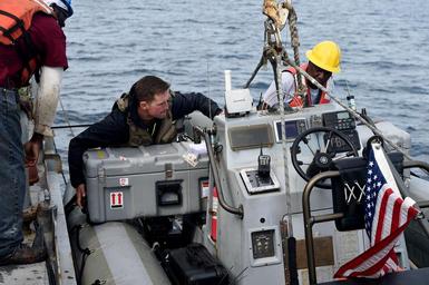MAKE A MEME View Large Image Mate 2nd Class Nicholas Keen, attached to Naval Oceanography Mine Warfare Center, loads a case containing an unmanned underwater vehicle into a rigid hull inflatable boat aboard the Military Sealift Command rescue and salvage ship USNS ...