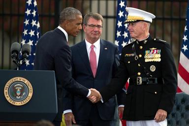 Keywords: neverforget spet. 11 spet11 pentagon 15th anniversary 15thanniversary 15th anniversary of september 11 15thanniversaryofseptember11 2001 2016 obama ej hersom ejhersom arlington virginia united states unitedstates us President Barack Obama shakes hands with Marine Corps Gen. Joseph F. Dunford Jr., chairman of the Joint Chiefs of Staff, as Defense Secretary Ash Carter looks on after a ceremony commemorating the 15th anniversary of the Sept. 11, 2001 attacks at the Pentagon in Arlington, Va. Sept. 11, 2016. (DoD photo by EJ Hersom) www.dvidshub.net President Barack Obama shakes hands with Marine Corps Gen. Joseph F. Dunford Jr., chairman of the Joint Chiefs of Staff, as Defense Secretary Ash Carter looks on after a ceremony commemorating the 15th anniversary of the Sept. 11, 2001 attacks at the Pentagon in Arlington, Va. Sept. 11, 2016. (DoD photo by EJ Hersom) www.dvidshub.net |