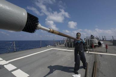 Keywords: uss carney (ddg 64); 6th fleet; usscarneyddg646thfleet mediterranean sea mediterraneansea outdoor 160913-N-ZE250-077 MEDITERRANEAN SEA (Sept. 13, 2016) - Gunner's Mate 2nd Class Meghan Smith cleans the barrel of a MK 45 5-inch light weight gun during post fire maintenance aboard USS Carney (DDG 64) while on patrol in the Mediterranean Sea Sept. 13, 2016. Carney, an Arleigh Burke-class guided-missile destroyer, forward-deployed to Rota, Spain, is conducting a routine patrol in the U.S. 6th fleet area of operations in support of U.S. national security interests in Europe. (U.S. Navy photo by Mass Communication Specialist 3rd Class Weston Jones/Released) 160913-N-ZE250-077 MEDITERRANEAN SEA (Sept. 13, 2016) - Gunner's Mate 2nd Class Meghan Smith cleans the barrel of a MK 45 5-inch light weight gun during post fire maintenance aboard USS Carney (DDG 64) while on patrol in the Mediterranean Sea Sept. 13, 2016. Carney, an Arleigh Burke-class guided-missile destroyer, forward-deployed to Rota, Spain, is conducting a routine patrol in the U.S. 6th fleet area of operations in support of U.S. national security interests in Europe. (U.S. Navy photo by Mass Communication Specialist 3rd Class Weston Jones/Released) |
