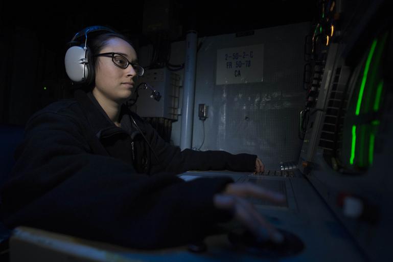 Keywords: uss carney (ddg 64); 6th fleet; usscarneyddg646thfleet mediterranean sea mediterraneansea people 160919-N-ZE250-121 MEDITERRANEAN SEA (Sept. 19, 2016) - Sonar Technician (Surface) 3rd Class Amy Palmer monitors the sonar system aboard USS Carney (DDG 64) while on patrol in the Mediterranean Sea Sept. 19, 2016. Carney, an Arleigh Burke-class guided-missile destroyer, forward-deployed to Rota, Spain, is conducting a routine patrol in the U.S. 6th fleet area of operations in support of U.S. national security interests in Europe. (U.S. Navy photo by Mass Communication Specialist 3rd Class Weston Jones/Released) 160919-N-ZE250-121 MEDITERRANEAN SEA (Sept. 19, 2016) - Sonar Technician (Surface) 3rd Class Amy Palmer monitors the sonar system aboard USS Carney (DDG 64) while on patrol in the Mediterranean Sea Sept. 19, 2016. Carney, an Arleigh Burke-class guided-missile destroyer, forward-deployed to Rota, Spain, is conducting a routine patrol in the U.S. 6th fleet area of operations in support of U.S. national security interests in Europe. (U.S. Navy photo by Mass Communication Specialist 3rd Class Weston Jones/Released) |