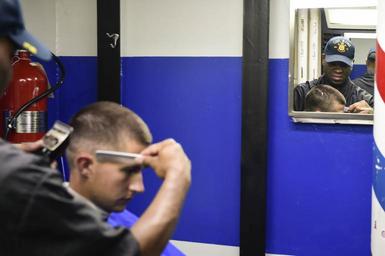 | Keywords: navy uss ross (ddg 71) ussrossddg71 ddg 71 ddg71 u.s. 6th fleet us6thfleet c6f ctf 65 ctf65 patrol larnaca cyprus larnacacyprus indoor 161008-N-FP878-028 LARNACA, Cyprus (Oct. 8, 2016) Petty Officer 2nd Class Khalil Wilkinscain from Philadelphia, gives Seaman Jacob Hughes from Olivehurst, Calif., a haircut aboard USS Ross (DDG 71) Oct. 8, 2016. Ross, an Arleigh Burke-class guided-missile destroyer, forward-deployed to Rota, Spain, is conducting naval operations in the U.S. 6th Fleet Area of Operations in support of U.S. national security interests in Europe and Africa. (U.S. Navy photo by Petty Officer 1st Class Theron J. Godbold/Released) 161008-N-FP878-028 LARNACA, Cyprus (Oct. 8, 2016) Petty Officer 2nd Class Khalil Wilkinscain from Philadelphia, gives Seaman Jacob Hughes from Olivehurst, Calif., a haircut aboard USS Ross (DDG 71) Oct. 8, 2016. Ross, an Arleigh Burke-class guided-missile destroyer, forward-deployed to Rota, Spain, is conducting naval operations in the U.S. 6th Fleet Area of Operations in support of U.S. national security interests in Europe and Africa. (U.S. Navy photo by Petty Officer 1st Class Theron J. Godbold/Released) |