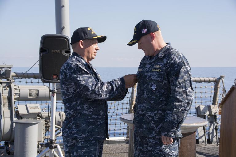 Keywords: uss carney (ddg 64); 6th fleet; uss carney change-of-command usscarneyddg646thfleetusscarneychangeofcommand mediterranean sea mediterraneansea outdoor 161105-N-N0901-118 MEDITERRANEAN SEA (Nov 5, 2016) - Cmdr. Ken Pickard, left, pins a command-at-sea pin on Cmdr. Pete Halvorsen, commanding officer, USS Carney (DDG 64) during a change of command ceremony aboard aboard USS Carney Nov. 5, 2016. Carney, an Arleigh Burke-class guided-missile destroyer, forward-deployed to Rota, Spain, is conducting a routine patrol in the U.S. 6th fleet area of operations in support of U.S. national security interests in Europe. (U.S. Navy photo by Petty Officer 2nd Class Alex Walsh/Released) 161105-N-N0901-118 MEDITERRANEAN SEA (Nov 5, 2016) - Cmdr. Ken Pickard, left, pins a command-at-sea pin on Cmdr. Pete Halvorsen, commanding officer, USS Carney (DDG 64) during a change of command ceremony aboard aboard USS Carney Nov. 5, 2016. Carney, an Arleigh Burke-class guided-missile destroyer, forward-deployed to Rota, Spain, is conducting a routine patrol in the U.S. 6th fleet area of operations in support of U.S. national security interests in Europe. (U.S. Navy photo by Petty Officer 2nd Class Alex Walsh/Released) |