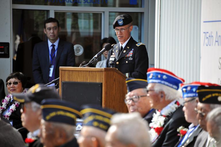 Keywords: u.s. army usarmy nisei san francisco sanfrancisco japanese linguist history culture japanese-americans japaneseamericans Col. Phil Deppert, commandant of the Defense Language Institute Foreign Language Center, and the National Japanese American Historical Society paid tribute to World War II Nisei veterans on their 75th anniversary of the Military Intelligence Service at Crissy Field in San Francisco Nov. 12. The Military Intelligence Service Historic Learning Center is located inside the abandoned airplane hangar where a small group of officers started a small school to teach the Japanese language at the Presidio of San Francisco in November 1941. That school would grow over time to become the Defense Language Institute Foreign Language Center. (U.S. Army photo by Patrick Bray/Released) Col. Phil Deppert, commandant of the Defense Language Institute Foreign Language Center, and the National Japanese American Historical Society paid tribute to World War II Nisei veterans on their 75th anniversary of the Military Intelligence Service at Crissy Field in San Francisco Nov. 12. The Military Intelligence Service Historic Learning Center is located inside the abandoned airplane hangar where a small group of officers started a small school to teach the Japanese language at the Presidio of San Francisco in November 1941. That school would grow over time to become the Defense Language Institute Foreign Language Center. (U.S. Army photo by Patrick Bray/Released)