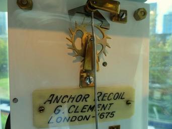 Keywords: 1675 anchor recoil escapement, G. Clement, London - Franklin Institue - DSC06665.JPG Exhibit in the Franklin Institute Philadelphia Pennsylvania USA I took this photograph 2011-10-20 11 51 35 Daderot Escapement collection in the Franklin Institute |