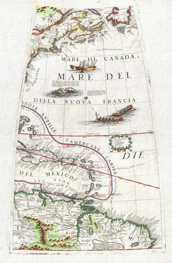 Keywords: 1688 Coronelli Globe Gore Map of NE North America, the West Indies, and NE South America - Geographicus - NEAmericaGore-coronelli-1688.jpg A fine example of Vincenzo Coronelli ™s extremely rare 1688 globe gore of Eastern America Covers from Newfoundland south along the New England and Virginia coastlines to the Bahamas Gigante and the West Indies showing parts of Cuba and all of Hispaniola Porto Rico and the Lesser Antilles as well as the northern parts of South America from modern day Venezuela to the Orinoco Delta and the Guianas As Royal Cartographer to King Louis XIV of France Coronelli had access to the most recent cartographic records coming from the New World “ particularly form the French occupied territories in North America and the West Indies Advocating French control of much of North America Coronelli limits New England Nuoua Inghilterra to the regions immediately surrounding Cape Cod and Boston Harbor Similarly New York Nuoua Iorck is confined to the coastal lands near New York City Connecticut and Long Island Though largely supplemented by the British by the time Coronelli drew this map he recognizes Sweden ™s claims to New Sweden Nuoua Suecia in the vicinity of Delaware Bay The West Indies are drawn with considerable accuracy with notations for cities ports islands and references to the powers that controlled them Offers good though somewhat inaccurate detail of South America ™s mountain and river systems particularly the Orinoco Additionally this map also shows several important sailing routes including both northern and southern routes to Europe Decorated by several vignettes including cod fishermen off the coast of New England frolicking Mentees and two rowboats plying the Atlantic Also depicts many of the important cod fishing banks between Cape Cod and Newfoundland This beautiful gore was originally drawn by Coronelli as part of his fantastic 42 inch Terresterial Globe Several examples of this magnificent globe are prized today by institutional collections in Europe and America Far rarer are the atlases that Coronelli published from his globe gores The Libro Dei Globi published in 1693 and again in 1701 is the first and likely the finest example of a world atlas composed entirely of globe gores Only seven complete examples of this rare atlas are known to have survived to modern times 1688 undated Size in 11 5 18 25 object history credit line accession number NEAmericaGore-coronelli-1688 Coronelli Vincento <i>Libro dei Globi</i> 1693 edition Geographicus-source PD-old-100 Vincenzo Coronelli Old maps of the Americas 1688 maps Maps in Italian Maps composed of gores |