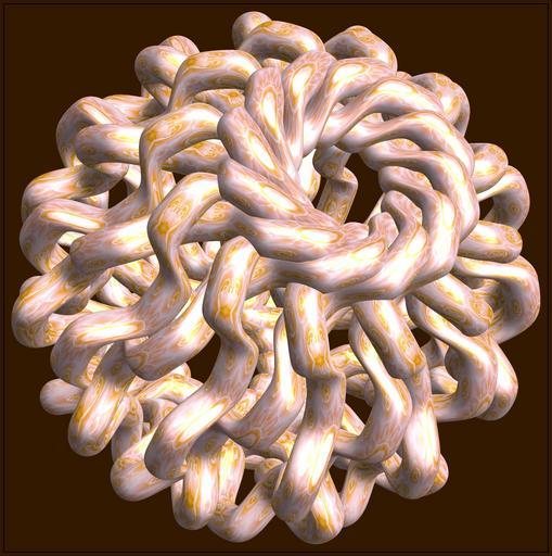 Keywords: mathematica 3d cg parametricplot3d texture torus 輪環 りんかん ドーナツ どーなつ 八芒星 はちぼうせい 八光星 はちこうせい 八稜星 はちりょうせい code program algorithm コード プログラム アルゴリズム geometric sculpture geometricsculpture shape geometry sculpture mapping テクスチャ マッピング 模様 もよう abstract 抽象 ちゅうしょう アブストラクト design pattern デザイン パターン graphic グラフィック グラフィクス structure 意匠 構造 symmetry 対称性 たいしょうせい シンメトリー 対称 たいしょう algorithm コード black background indoor a = 12; (* center hole size of a torus *) b = 8; (* octa-torus *) c = -22; (* distance from the center of rotation *) d = 16; (* number of torus *) h = 1; (* height of a torus *) SetOptions[ParametricPlot3D, PlotRange -> Full, Mesh -> None, Boxed -> False, Axes -> False, PlotPoints -> 400, ImageSize -> 3000, Background -> Darker[Orange, 0.8], PlotStyle -> Directive[Specularity[White, 30], Texture[Import["D:/tmp/861.jpg"]]], TextureCoordinateFunction -> ({#4, #5 2 Pi} &), Lighting -> "Neutral"]; f[v_] := Sin[2 Sin[Sin[Sin[v]]]]; x = (a - Cos[t] - f[b s]) Cos[s + Pi/b]; y = (a - Cos[t] - f[b s]) Sin[s + Pi/b]; z = (a - Sin[t] - h f[b s]) + c; rm = Table[{x, y, z}.RotationMatrix[2 i Pi/d, {1, 1, 0}], {i, d}]; ParametricPlot3D[rm, {t, 0, 2 Pi}, {s, 0, 2 Pi}] (*--- The Texture *) a = 12; (* center hole size of a torus *) b = 8; (* octa-torus *) c = -22; (* distance from the center of rotation *) d = 16; (* number of torus *) h = 1; (* height of a torus *) SetOptions[ParametricPlot3D, PlotRange -> Full, Mesh -> None, Boxed -> False, Axes -> False, PlotPoints -> 400, ImageSize -> 3000, Background -> Darker[Orange, 0.8], PlotStyle -> Directive[Specularity[White, 30], Texture[Import["D:/tmp/861.jpg"]]], TextureCoordinateFunction -> ({#4, #5 2 Pi} &), Lighting -> "Neutral"]; f[v_] := Sin[2 Sin[Sin[Sin[v]]]]; x = (a - Cos[t] - f[b s]) Cos[s + Pi/b]; y = (a - Cos[t] - f[b s]) Sin[s + Pi/b]; z = (a - Sin[t] - h f[b s]) + c; rm = Table[{x, y, z}.RotationMatrix[2 i Pi/d, {1, 1, 0}], {i, d}]; ParametricPlot3D[rm, {t, 0, 2 Pi}, {s, 0, 2 Pi}] (*--- The Texture *) |