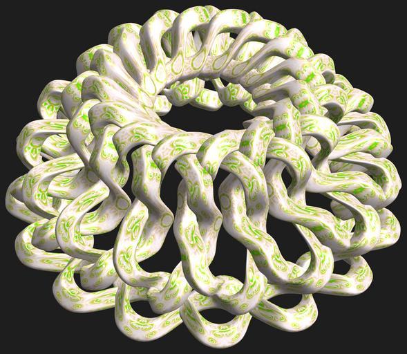 | Keywords: mathematica 3d cg parametricplot3d texture torus 輪環 りんかん ドーナツ どーなつ 五芒星 ごぼうせい 五光星 ごこうせい 五稜星 ごりょうせい code program algorithm コード プログラム アルゴリズム pentagram geometric sculpture geometricsculpture shape geometry sculpture mapping テクスチャ マッピング 模様 もよう abstract 抽象 ちゅうしょう アブストラクト design pattern デザイン パターン graphic グラフィック グラフィクス structure 意匠 構造 symmetry 対称性 たいしょうせい シンメトリー 対称 たいしょう algorithm コード organic pattern black background indoor plant foliage flower bouquet a = 8; (* center hole size of a torus *) b = 5; (* penta-torus *) c = 8; (* distance from the center of rotation *) d = 16; (* number of torus *) h = 1; (* height of a torus *) SetOptions[ParametricPlot3D, PlotRange -> Full, Mesh -> None, Boxed -> False, Axes -> False, PlotPoints -> 300, ImageSize -> 3000, Background -> RGBColor[{30, 30, 30}/255], PlotStyle -> Directive[Specularity[White, 70], Texture[Import["D:/tmp/864.jpg"]]], TextureCoordinateFunction -> ({#4, #5 2 Pi} &), Lighting -> "Neutral"]; f[v_] := Sin[2 Sin[Sin[Sin[v]]]]; x = (a - Cos[t] - Sin[b s]) Cos[s + Pi/(2 b)]; y = (a - Cos[t] - Sin[b s]) Sin[s + Pi/(2 b)]; z = (f[t] - h f[b s]) + c; rm = Table[{x, y, z}.RotationMatrix[2 i Pi/d, {1, 1, 1}], {i, d}]; ParametricPlot3D[rm, {t, 0, 2 Pi}, {s, 0, 2 Pi}] (*--- The Texture *) a = 8; (* center hole size of a torus *) b = 5; (* penta-torus *) c = 8; (* distance from the center of rotation *) d = 16; (* number of torus *) h = 1; (* height of a torus *) SetOptions[ParametricPlot3D, PlotRange -> Full, Mesh -> None, Boxed -> False, Axes -> False, PlotPoints -> 300, ImageSize -> 3000, Background -> RGBColor[{30, 30, 30}/255], PlotStyle -> Directive[Specularity[White, 70], Texture[Import["D:/tmp/864.jpg"]]], TextureCoordinateFunction -> ({#4, #5 2 Pi} &), Lighting -> "Neutral"]; f[v_] := Sin[2 Sin[Sin[Sin[v]]]]; x = (a - Cos[t] - Sin[b s]) Cos[s + Pi/(2 b)]; y = (a - Cos[t] - Sin[b s]) Sin[s + Pi/(2 b)]; z = (f[t] - h f[b s]) + c; rm = Table[{x, y, z}.RotationMatrix[2 i Pi/d, {1, 1, 1}], {i, d}]; ParametricPlot3D[rm, {t, 0, 2 Pi}, {s, 0, 2 Pi}] (*--- The Texture *) |