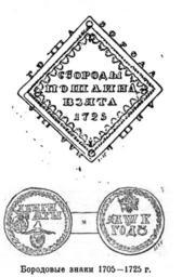 | Keywords: Бородовые знаки 1705-1725.gif ru Это изоб ажение бо одовых знаков 1705-1725 годов из книги Александ а Б икне а «»Иллюст и ованная исто ия Пет а Великого Том пе вый 1902 http //www runivers ru/lib/book4353/53072/ Б икне Александ Густавович PD-Art Uploaded with UploadWizard Peter I on coins |