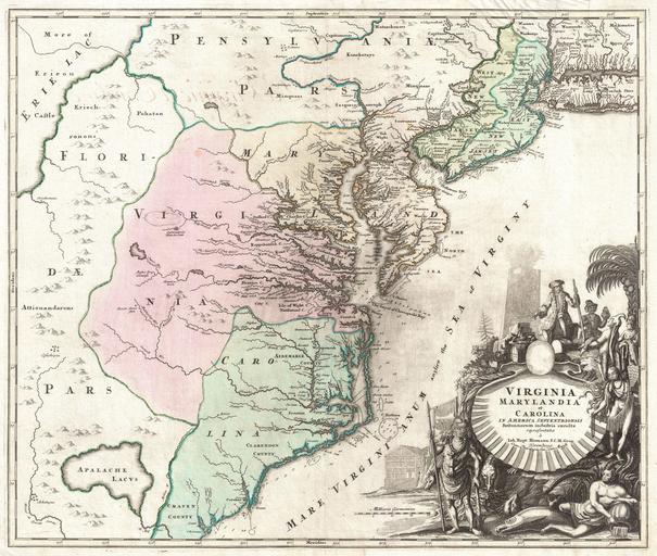 Keywords: 1715 Homann Map of Carolina, Virginia, Maryland and New Jersey - Geographicus - VirginiaMarylandiaCarolina-homann-1715.jpg An exceptionally beautiful example of J B Homann's c 1715 map of Virginia Carolina Maryland and New Jersey; considered one of the most important and decorative maps of is region to appear in the 18th century This fine decorative map covers from New York City and Long Island south along the Atlantic Cost as far as modern day Georgia and as far west as Lake Erie Homann drew this map in response to Virginia Lieutenant-Governor Alexander Spotswood's plan to settled the little known interior of Virginia with German immigrants Shown here is the first mapping of Germantown Teutsche Statt on the Rappahanock River and Fort Christanna Christ Anna Fort on the Makharing River Fort Christanna was built with the intention of defending the region against incursions from hostile American Indian groups such as the Tuscarora to the west Christanna also acted as the headquarters of the Virginia Indian Company a stock venture founded in 1714 with the intention of trading with indigenous groups in the interior Though Homann's remarkable representation of Spottswood's plan is extraordinarily up-to-date considering that Fort Christana was founded in the same year that this map was initially published the remainder of the map embraces a number of common misconceptions and cartographic inaccuracies common to the region Probably the most notable of these is his inclusion of Apalache Lacus This fictional lake the source of the May River appeared on maps of this region since the mid 16th century Le Moyne-De Bry map and was popularized by Mercator and Hondius in 1606 It would remain on maps well into the mid 18th century before exploration and settlement finally disproved the theory Further north Lake Erie and been expanded dramatically and shifted somewhat to the south where it takes on the appearance of a vast inland sea occupying the entire northwestern quadrant of the map This region west of the English colonies and north as far as Pennsylvana Homann attaches to the Spanish claims in Florida Homan's also offers a wealth of detail along the Atlantic coast where most of the European colonization efforts were focused From Long Island about two-thirds of which is shown south to Craven County Carolina countless towns and cities are identified New York City is mapped on the southern tip of Manhattan Island but is not specifically labeled New Jersey is divided into the colonial provinces of East New Jersey and West New Jersey Curiously Homann maps a large inland lake Zuyd Lac straddling the New Jersey - Pennsylvania border This is no doubt a early misinterpretation of the natural widening of the Delaware River at the Delaware Water Gap Heading south along the Delaware River Philadelphia is identified and beautifully rendered as a grid embraced in four quadrants Both the Delaware Bay and the Chesapeake Bay are rendered in full and even include a number of undersea notations and depth soundings In Virginia and Carolina the river systems are surprisingly well mapped and a primitive county structure is beginning to emerge The early Virginia counties of Rappahannock Henrico City Isle of Wright Nansemond Northumberland Middlesex Gloster and Corotvk are noted Similarly in Carolina a number of counties are named most of which refer to the Lords Proprietors including Albemarle Clarenden and Craven Cape Fear Cape Lookout and Cape Hattaras are noted and a number of anchorages reefs and depth sounding are noted along the entire coastline The lower right quadrant of this map is occupied by a fabulous decorative title cartouche Centered on an enormous scallop shell bearing the map's title and Homann's Privilege the cartouche features a number of stylized American Indians trading with European merchants The wealth of the region is expressed by an abundance of fish game and other trade products 1715 undated Size in 23 5 19 75 object history credit line accession number VirginiaMarylandiaCarolina-homann-1715 Homann J B <i>Altas Novus</i> c 1715 Geographicus-source PD-old-100 Johann Baptist Homann Old maps of Virginia 1715 Homann 1715 maps Virginia et al Homann Old maps of North Carolina 1715 Homann Old maps of Maryland 1715 Homann Old maps of New Jersey 1715 Homann Old maps of Delaware 1715 Homann Maps in Latin Virginia et al Homann |