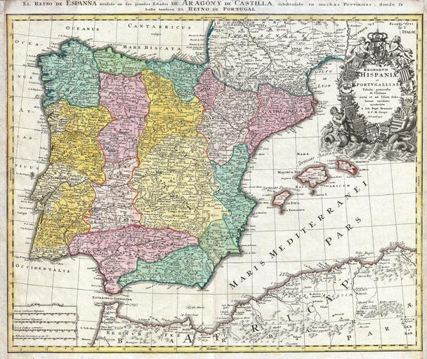 | Keywords: 1730 Homann Map of Spain and Portugal - Geographicus - Hispania-homann-1730.jpg A beautifully detailed c 1730 J B Homann map of Spain and Portugal Depicts the Iberian peninsula in considerable detail including the Balearic Islands of Majorca Minorca and Ibiza Also covers parts of France and northern Africa The map notes fortified cities villages roads bridges forests castles and topography Elaborate title cartouche in the upper right quadrant features two mermen supporting a wreath and 15 armorial crests 14 crests for the various regions of Spain in addition to one more depicting the Spanish royal arms Map scales in lower left quadrant Alternative title in Spanish in top margin El Reyno de Espanna dividido en dos grandes Estados de Argon Y de Castilla subdividido en muchas Provincias donde le halla tambien El Reyno de Portugal This map was drawn in Nuremberg by J B Homann and included in the Homann Heirs Maior Atlas Scholasticus ex Triginta Sex Generalibus et Specialibus ¦ circa 1730 undated Size in 23 19 5 object history credit line accession number Hispania-homann-1730 <i>Major Atlas Scholasticus Ex Triginta sex Generalibus et Specialibus Mappis Homannianis </i> c 1750 / Also issued in Homann's <i>Grosser Atlas</i> Geographicus-source PD-old-100 Johann Baptist Homann Old maps of the Iberian Peninsula 1730 maps Maps in Latin |