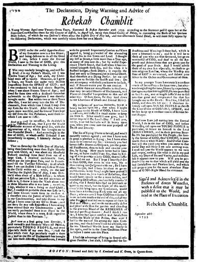 Keywords: 1733 RebekahChamblit Boston.jpg The declaration dying warning and advice of Rebekah Chamblit A young woman aged near twenty-seven years executed at Boston September 27th 1733 According to the sentence pass'd upon her at the Superiour Court holden there for the county of Suffolk in August last being then found guilty of felony in concealing the birth of her spurious male infant of which she was delivered when alone the eighth day of May last and was afterwards found dead as will more fully appear by the following declaration which was carefully taken from her own mouth Early American Imprints Series 1 1733 Rebekah Chamblit PD-old-100 Boston in the 1730s Kneeland Green |