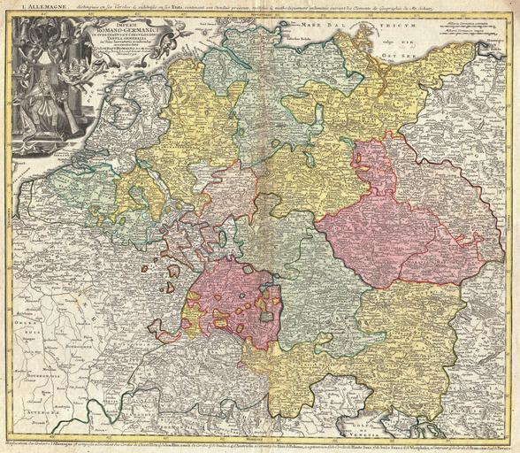 Keywords: 1740 Homann Map of the Holy Roman Empire ( Germanic Empire ) - Geographicus - ImperiiRomanoGerman-homann-1740.jpg A beautifully detailed c 1740 J B Homann map of those parts of Europe dominated by the Holy Roman Empire or the German Empire Depicts most of central Europe from the Netherlands eastward as far as Poland and Hungary and as far south as northern Italy and the Gulf of Venice Elaborate title cartouche in the upper left quadrant features the Emperor surrounded by angels and heraldic symbols Map scales in upper right hand quadrant Key to color coding outside border on lower margin Alternative title in French in top margin L ™ Allemagne distinguee en ses Cercles subdivisee en ses Etats contenant los Elements de Geographiae de Mr Shatz This map was drawn in Nuremberg by J B Homann and included in the 1752 Homann Heirs Maior Atlas Scholasticus ex Triginta Sex Generalibus et Specialibus ¦ circa 1720 undated Size in 21 18 75 object history credit line accession number ImperiiRomanoGerman-homann-1740 <i>Major Atlas Scholasticus Ex Triginta sex Generalibus et Specialibus Mappis Homannianis </i> c 1730 / Also issued in Homann's <i>Grosser Atlas</i> Geographicus-source PD-old-100 Johann Baptist Homann Old maps of the Holy Roman Empire 1740 maps Maps in Latin |