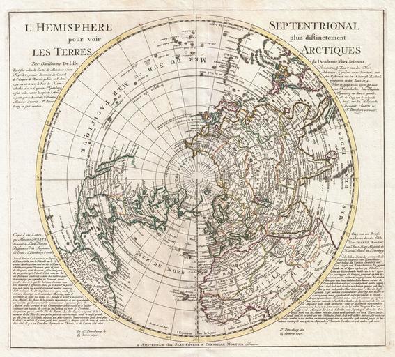 | Keywords: 1741 Covens and Mortier Map of the Northern Hemisphere ( North Pole, Arctic ) - Geographicus - NorthPole-covensmortier-1741.jpg This is a stunning and important map of the Northern Hemisphere originally drawn by Guillaume de L'Isle in 1714 and updated by Coven's and Mortier in 1741 Covers from the North Pole south in all directions to include the Arctic Regions all of North American Central America Asia and Europe with parts of South America and most of Africa To either side of the map proper in French on left side and in Dutch on right side is a letter written by Monsieur Swartz a Danish explorer in the service of the Tzar regarding his c 1734 - 1740 explorations near Japan and Kamchatka Covens and Mortier's most interesting updates over the De L'Isle version of this map relate to explorations in North America and in East Asia North America is drawn as it appeared at the height of the Colonial period English colonies skirt the east coast the French control the Great Lakes regions and Louisiana and the Spanish dominate in Mexico California and the Southwest California is drawn connected to the mainland with a dotted line - indicating that European map publishers were not yet prepared to give up on the idea that California may indeed be an Island Names the city of Quivara which is one of the lands associated with Spanish legends of the Seven Cities of Gold Also notes the Sioux and the Apalache peoples As befits De L'Isle's scientific approach to cartographer much of the unexplored northwest of America remains blank By contrast the northeast parts of Asia which had recently been explored by Vitus Bering and Tschirikow offer a number of interesting elements The land of Compagnie is shown just the east of Yedso likely Hokkaido with a note regarding its mysterious discovery by Jean de Gama Often called de Gamma Land or Gama this island was supposedly discovered in the 17th century by a mysterious figure known as Jean de Gama Various subsequent navigators claim to have seen this land but it was left to Bering to finally debunk the myth In 1729 he sailed for three days looking for Juan de Gama land but never found it Thought it may be little more than a mis-mapping of Hokkaido or the Japanese Kuriles Gama or Compagnie remained on maps for about 50 years following Bering's voyages until the explorations of Cook confirmed the Bering findings Japan itself is only vaguely mapped though Edo Yendo is indicated Just to the west the Peninsula of Korea is drawn with a fairly accurate if slightly bulbous form Further south Formosa and the Philippines are well mapped Published by Covens and Mortier in their c 1741 reissue of Guillaume de L'Isle's Atlas Nouveau circa 1741 dated 1739 Size in 21 19 object history credit line accession number NorthPole-covensmortier-1741 Covens J Mortier C <i>Atlas nouveau contenant toutes les parties su Monde ou sont exactement remarquees les empires monarchies royaumes etats republiques c Par Guillaume de l'Isle</i> c 1841 editon Geographicus-source PD-Art-100 Old maps of the Arctic Old maps of Earth's hemispheres Maps in French Maps in Dutch Covens en Mortier 1741 maps Hemispheres centered North pole |
