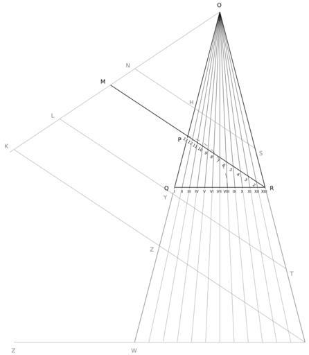 Keywords: 1743Strahle tabvifig4.svg en Illustration of Daniel Stråhle's geometric method for generating the sounding lengths of strings in an irregular tuning with twelve pitches per octave that is close to equal temperament Line segment MR represents the string length of the lowest sounding pitch MP the pitch one octave higher and the points labeled 2 through 12 the endpoints for the pitches between them Daniel P Stråhle Nytt Påfund at finna Temperaturen i stämningen för thonerne å Claveret ock dylika Instrumenter Kongliga Swenska Wetenskaps Academiens Handlingar vol IV October November ock December Lorentz Ludewig Grefing Stockholm 1743 p 281-285 Daniel P Stråhle; reproduced as svg by User Mireut 1743 http //gdz sub uni-goettingen de/dms/load/img/ PPN PPN324352840_0005 DMDID dmdlog58 PD-old-100 Musical tuning Music diagrams |