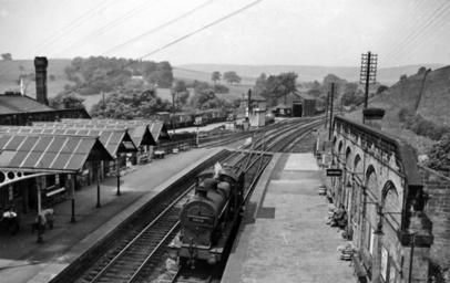 Keywords: blackandwhite monochrome train railroad outdoor vehicle sport road architecture infrastructure building building structure black and white Bakewell Station. View NW of station on the still very active Peak Main Line. This station, and the line Matlock - Chinley were closed in March 1967 (July 1968 for Goods). Here a Class 4F 0-6-0 runs Up light-engine, probably after banking a freight train up from Rowsley to Peak Forest. Bakewell Station. View NW of station on the still very active Peak Main Line. This station, and the line Matlock - Chinley were closed in March 1967 (July 1968 for Goods). Here a Class 4F 0-6-0 runs Up light-engine, probably after banking a freight train up from Rowsley to Peak Forest.