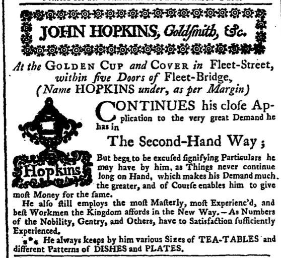 Keywords: 1751 GoldenCup advertisement in Whitehall Evening Post or London Intelligencer January3.png Advertisement for goldsmith; at the Golden Cup and Cover in Fleet Street within five doors of Fleet-Bridge London Whitehall Evening Post or London Intelligencer London England January 3 1751 1751 Whitehall Evening Post or London Intelligencer London England PD-old-100 Shop signs in 18th century London 1751 Goldsmiths 1751 1751 in London |