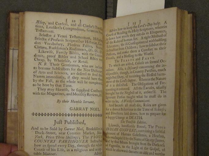 Keywords: 1755 GarratNoel NY BostonPublicLibrary p23.jpg From A catalogue of books in history divinity law arts and sciences and the several parts of polite literature to be sold by Garrat Noel bookseller in Dock-Street New York New-York Printed by H Gaine in Queen-Street between the Fly and Meal-Markets 1755 24 p ; 16 cm Courtesy of the Trustees of the Boston Public Library/Rare Books 1755 Printed by H Gaine PD-old-100 Garrat Noel |