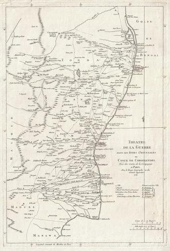 Keywords: 1759 La Rouge Map of Eastern India or Coromandel (Madras and Pondicherry) - Geographicus - IndiaEast-lerouge-1759.jpg This is an attractive 1759 map of Eastern India or Coromandel by George-Louis le Rouge Covers the Indian coast from Marawa in the south northward past Pondicherry and Madras as far as Pallikata on the Bay of Bengal Extends inland as far as Mashur Offers wonderful inland detail of both roads and river systems Designed to illustrate the then raging struggle by the various colonial powers to control the rich Indian trade Ports are underlined and color coded to signify the colonial empire that controlled them French possessions including Pondicherry are in green Denmark is dark green England is red Holland is yellow and Portugal gray Prepared for issue as plate 151 in Le Rouge ™s Atlas General 1759 dated Size in 13 25 20 object history credit line accession number IndiaEast-lerouge-1759 <i>Atlas General Contenant le Detail Des Quartre Parties Du Monde principalement Celui de l'Europe</i> Compiled atlas 1742-1762 Geographicus-source PD-Art-100 1759 maps of India Old maps of Tamil Nadu French language maps of Asia Maps by Georges Louis Le Rouge |