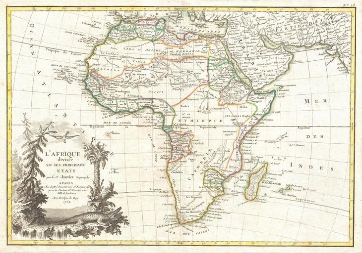 Keywords: 1762 Janvier Map of Africa - Geographicus - Africa-janvier-1762.jpg A beautiful example of Jean Janvier's 1762 map of Africa Covers the entire continent as well as the Island of Madagascar and adjacent parts of Persia and Arabia Divided into various regions with color-coding according to the colonial power active in the region Course of the Nile follows the Ptolemaic two lake theory Shows the Mountains of the Moon just south of the Ptolemaic lakes In southeastern Africa there is a long lake speculatively drawn in and labeled L Maram but which most likely represents an embryonic Lake Tanganyika Much of central Africa is blank suggesting the profound lack of knowledge of the interior Nonetheless several major river systems including the Niger the Congo and parts of the Nile to show indications of active exploration Names numerous African kingdoms and tribal groups throughout though admittedly few correspond with the groups we know today In the lower left hand quadrant there is an elaborate decorative title cartouche exhibiting a Nile crocodile a leopard vegetation a bird and a waterfall - possibly one of the Nile cataracts Drawn by J Janvier for issue as plate no 23 in Jean Lattre's 1775 issue of the Atlas Moderne 1762 dated Size in 17 5 12 object history credit line accession number Africa-janvier-1762 Lattre Jean <i>Atlas Moderne ou Collection de Cartes sur Toutes les Parties du Globe Terrestre</i> c 1775 Geographicus-source PD-old-100 1760s maps of Africa 1762 maps Maps by Jean Janvier Images from Geographicus |