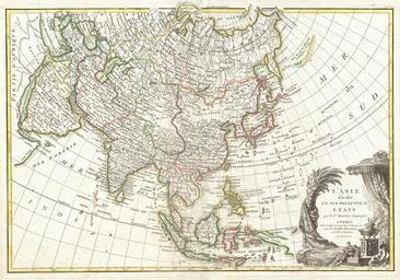 | Keywords: 1770 Janvier Map of Asia - Geographicus - Asia-janvier-1770.jpg A beautiful example of Le Sieur Janvier's 1771 map of Asia Covers from Africa and the Mediterranean east to Bering Strait Detroit du Norte ou d'Anian and south as far as Java and New Guinea This map is most interesting in its rendering of the largely unexplored extreme northwest of Asia Yeco or Hokkaido is mapped only speculatively with its western borders unknown Shows Sakhalin Island in an embryonic state Just to the east of Yeco Hokkaido Janvier maps the apocryphal Terre de Gama or Terre de la Company Often called de Gamma Land or Gama these islands were supposedly discovered in the 17th century by a mysterious figure known as Jean de Gama Various subsequent navigators claim to have seen this land but it was left to Bering to finally debunk the myth In 1729 he sailed for three days looking for Juan de Gama land but never found it Thought it may be little more than a mis-mapping of Hokkaido or the Japanese Kuriles Gama or Compagnie remained on maps for about 50 years following Bering's voyages until the explorations of Cook confirmed the Bering findings Though the mainland of Siberia and northeast Asia are remarkably well mapped based upon the explorations of Vitus Bering and Tschirikow a further anomaly appears in the form of an unusual landmass just to the east of Kamchatka roughly where the Aleutian Islands are today A note reads that this land mass claims that it was seen in 1741 suggesting either Vitus Bering or Alexei Chirikov This is most likely an embryonic representation of the Muller Peninsula The Muller Peninsula was a postulated by Gerhard Muller around this time based on recorded sightings of the Aleutian Archipelago and their misinterpretation of it as a single land mass Further to the south New Guinea Novelle Guinee is maps speculatively with most of its eastern and southern borders left either blank or hidden behind the grand title cartouche A decorative title cartouche displaying the riches of the continent appears in the lower right hand quadrant A fine map of the region Drawn by J Janvier in 1771 for issue as plate no 24 in Jean Lattre's 1776 issue of the Atlas Moderne 1770 undated Size in 17 5 12 5 object history credit line accession number Asia-janvier-1770 Lattre Jean <i>Atlas Moderne ou Collection de Cartes sur Toutes les Parties du Globe Terrestre</i> c 1775 Geographicus-source PD-old-100 Old maps of Asia 1770 maps Maps by Jean Janvier Images from Geographicus French language maps of Asia |
