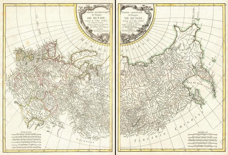 Keywords: 1771 Bonne Map of Russia (2 maps) - Geographicus - Russia-bonne-1772.jpg A beautiful example of Rigobert Bonne's 1771 decorative map of Russia On two sheets covers from the Baltic Sea to Siberia and the Bering Straits extends south as far as the Caspian Sea Sakhalin and Kamchatka extends north well into the Arctic Details this fast region and its many complex river systems and mountains ranges European Russia is divided into various smaller states including Kiev Woronez Bielogorod Moscow Astrakan Kasan etc The extreme northeast clearly exhibits information gathered by the explorations of Vitus Bering and Tschirikow especially with regard to Kamchatka and the Bering Strait A mysterious land mass - clearly North America is noted in beyond the Siberian mainland with a note Cote decouv en 1730 Coast Discovered in 1730 A decorative baroque title cartouche appears top center Drawn by R Bonne in 1771 for issue as plate nos 22 and 22 A in Jean Lattre's 1776 issue of the Atlas Moderne 1771 dated Size in 18 27 object history credit line accession number Russia-bonne-1772 Lattre Jean <i>Atlas Moderne ou Collection de Cartes sur Toutes les Parties du Globe Terrestre</i> c 1775 Geographicus-source PD-old-100 Old maps of the Russian Empire 1771 maps Images from Geographicus Maps in French |
