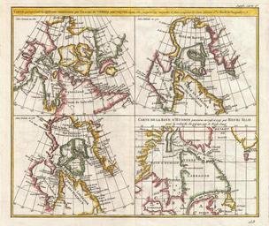 Keywords: 1772 Vaugondy - Diderot Map of the Hudson Bay and the Arctic - Geographicus - TerresArctiques-vaugondy-1773.jpg This is a fascinating combination of four contrasting maps of the same area a single sheet All four maps cover the northeastern part of America and Greenland including the Hudson Button and Baffin Bay regions the Davis Straits and the Coast Labrador The upper left map depicts the work of Sanson in 1650 the upper right map the work of De L ™Isle in 1700 the lower left map the world of De L ™Isle in 1703 and the lower right map the work of Henri Ellis in 1747 This four map chart is one of the earliest examples of comparative cartography Prepared by Vaugondy as plate no 9 for the Supplement to Diderot ™s Encyclopédie 1773 dated Size in 14 12 object history credit line accession number TerresArctiques-vaugondy-1773 Supplement to Diderot's <i>Encyclopédie ou dictionnaire raisonné des sciences des arts et des métiers </i> or Vaugondy's <i>Recueil de 10 Cartes Traitant Particulierement de L'Amerique du Nord</i> 1779 Geographicus-source PD-Art-100 Robert de Vaugondy Old maps of Canada Old maps of the Arctic 1773 maps Hudson Bay Maps in French |