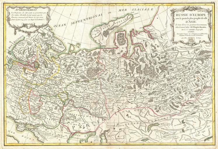 Keywords: 1775 Janvier Map of Western Russia - Geographicus - RussiaWest-janvier-1775.jpg A beautiful example of Jan Janvier's curious decorative map of Western Russia Covers from Poland and the Baltic Sea eastward as far as Ilimskoy Siberia extends south to the Black Sea and north as far as Nouvelle Zembla and the Arctic Sea Ostensibly focuses on the most inhabited portions of the Russian empire in Europe and Asia Offers excellent detail throughout showing mountains rivers forests national boundaries regional boundaries forts and cities A large decorative title appears in the upper right quadrant Upper left quadrant features an advertisement Drawn by Jan Janvier around 1775 for issue as plate no 22 in Jean Lattre's 1776 issue of the Atlas Moderne 1775 undated Size in 18 12 5 object history credit line accession number RussiaWest-janvier-1775 Lattre Jean <i>Atlas Moderne ou Collection de Cartes sur Toutes les Parties du Globe Terrestre</i> c 1775 Geographicus-source PD-old-100 Maps by Jean Janvier 1775 maps Old maps of the Russian Empire |