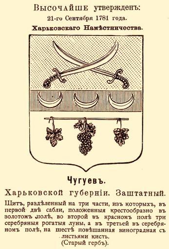 Keywords: Хар губ Чугуев 1781 из Винклера.jpg Official Russian Empire Chuguev coat of arms Chuguev Ге б Российской Импе ии заштатного го ода Чугуев Ха ьковской губе нии с официальным описанием в Ге бовнике Винкле а П П фон-Винкле Ге бы го одов губе ний областей и посадов Российской Импе ии внесенные в Полное Соб ание законов с 1649 по 1900 год Дозволено цензу ою С -Пете бу г 20 Июля 1899 года Издание книгото говца Ив Ив Иванова С -Пете бу г Типог афия И Комелова П яжка д 3 1899 \ Scanned paper book 1775 Ге бовник Ще батова /1781 утве ждён / 1899 published П П фон Винкле \ Pavel von Vinkler PD-old PD-RusEmpire PD-RU-exempt coats of arms Gerbovnik Vinklera - City CoAs Чугуeв Coats of arms of Chuhuiv 1781 in Kharkov Governorate Swords in heraldry 3 crescents argent in heraldry