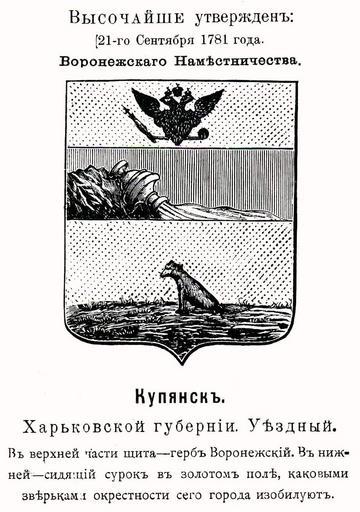 Keywords: Хар губ Купянск 1781 из Винклера.jpg Official Russian Empire coat of arms Kupiansk Ге б Российской Импе ии уездного го ода Купянск в 1899 Ха ьковской губе нии в 1781 - Во онежского наместничества с официальным описанием в Ге бовнике Винкле а П П фон-Винкле Ге бы го одов губе ний областей и посадов Российской Импе ии внесенные в Полное Соб ание законов с 1649 по 1900 год Дозволено цензу ою С -Пете бу г 20 Июля 1899 года Издание книгото говца Ив Ив Иванова С -Пете бу г Типог афия И Комелова П яжка д 3 1899 \ Scanned by Vizu 1781 \ 1899 published П П фон Винкле \ Pavel von Vinkler PD-old PD-RusEmpire PD-RU-exempt coats of arms Gerbovnik Vinklera - City CoAs Kупянck Coats of arms of Voronezh Governorate Coats of arms of Kupiansk 1781 in Kharkov Governorate