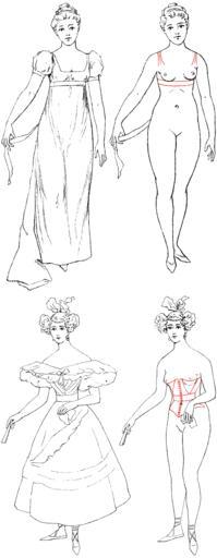 | Keywords: 1800-vs-1830 womens clothing pressure-points.png Analysis by Carl Heinrich Stratz 1858-1924 of the pressure points of women's clothing styles that is areas where the clothing is held tightly against the outline of the body or from which the weight of the clothing is suspended These are shown in red color in the image Above The pressure-points of ca 1800 high-waisted Empire clothing styles Below The pressure points for ca 1830 narrow-waisted clothing styles Notice that the Empire style does not involve constricting the waist Also the Empire style involves partially suspending the weight of the clothing from the shoulders something considered highly-desirable by many late 19th-century dress-reform advocates and the overall weight of the Empire clothing would have been less than that of the 1830-era clothing ;Upper left Fig 73 Empirecostüm im Jahre 1800 Costümbild aus dem Figaro illustré ;Upper right Fig 74 Körperumrisse von Fig 73 ;Lower left Fig 75 Costümbild aus dem Jahre 1830 Journal des dames ;Lower right Fig 76 Körperumrisse von Fig 75 This image is derived from images Image Empirecostum imJahre1800 gif and Image Costumbild aus demJahre1830 gif uploaded by Haabet Ultimate source Die Frauenkleidung by Dr C H Stratz 1902 pages 135-138 <gallery>File Costumbild aus demJahre1830 gif File Empirecostum imJahre1800 gif</gallery> 1902 Carl Heinrich Stratz 1858-1924 PD-old-auto-1923 1924 1800s fashion Empire silhouette Stratz_-_Die_Frauenkleidung Original upload log wikitable - - 2006-07-27 17 35 34 1160 × 2979 211608 bytes Churchh <nowiki>Analysis by Carl Heinrich Stratz 1858-1924 of the pressure points of women's clothing styles that is areas where the clothing is held tight against the outline of the body or from which the weight of the clothing is suspended These are shown in r</nowiki> |