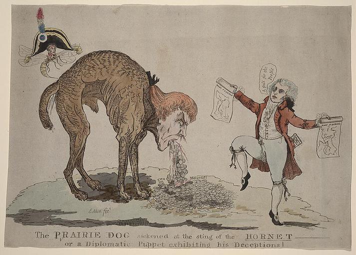 | Keywords: 1804 prairie dog sickened at the sting of the hornet or a diplomatic puppet exhibiting his deceptions byJamesAkin LC.jpg Title The prairie dog sickened at the sting of the hornet or a diplomatic puppet exhibiting his deceptions / James Akin fect Creator s Akin James ca 1773-1846 artist Date Created/Published Newburyport Mass s n 1804 Medium 1 print on pale blue-grey laid paper etching with watercolor ; 28 5 x 40 6 cm sheet Summary James Akin's earliest-known signed cartoon The Prairie Dog is an anti-Jefferson satire relating to Jefferson's covert negotiations for the purchase of West Florida from Spain in 1804 Jefferson as a scrawny dog is stung by a hornet with Napoleon's head into coughing up Two Millions in gold coins the secret appropriation Jefferson sought from Congress for the purchase On the right dances a man possibly a French diplomat with orders from French minister Talleyrand in his pocket and maps of East Florida and West Florida in his hand He says A gull for the People Notes The print was probably published in Newburyport Massachusetts where Akin was working in 1804-6 Repository Library of Congress Prints and Photographs Division Washington D C 20540 USA http //www loc gov/pictures/item/2002708977/ 1804 Creator James Akin 1846 James Akin 1804 in the United States Caricatures of Thomas Jefferson Caricatures of Napoleon I of France 1804 cartoons 1800s political cartoons of the United States |